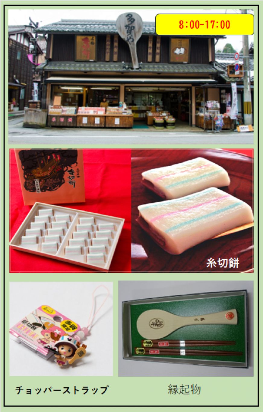 たがゆいちゃんグッズ、多賀そば、笑門絵馬も販売。