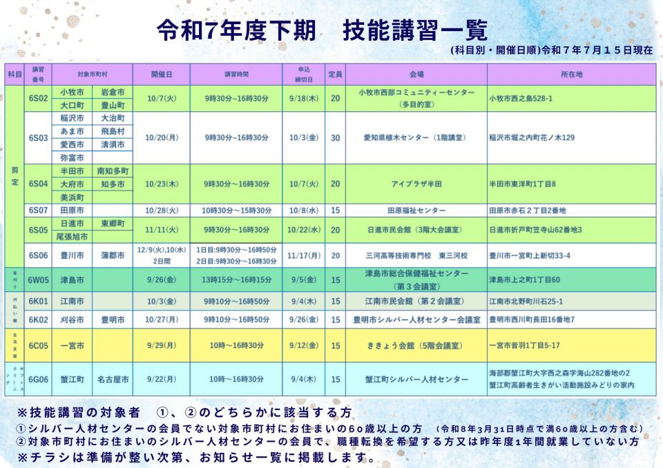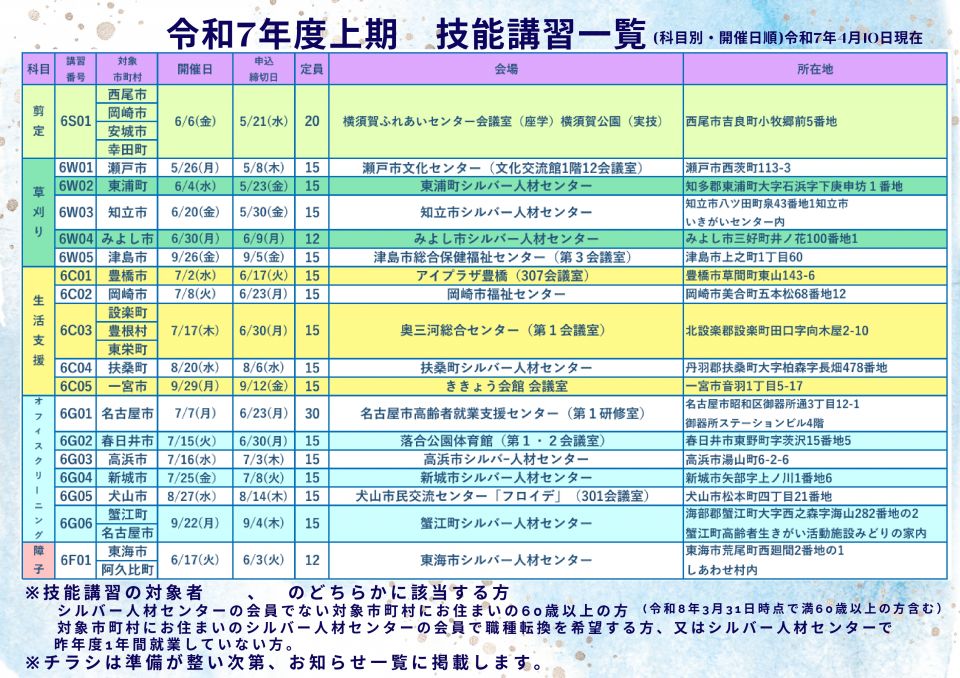 令和7年度上期 技能講習一覧