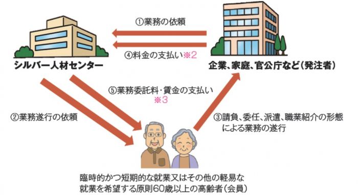 シルバー人材センターは、企業、家庭、官公庁などから業務を受注し、それらを次の①から③のいずれかの形態により、臨時的かつ短期的な就業又はその他の軽易な就業を希望する高齢者(会員)に、働く場を提供します。