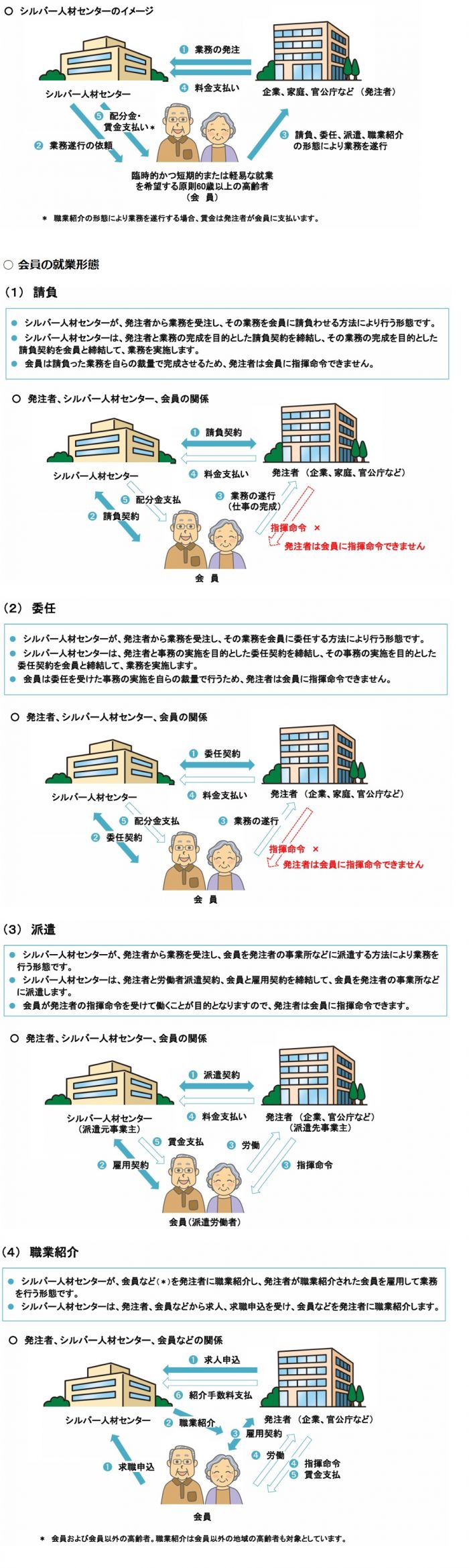 「センターと会員」「発注者と会員」の間にはいずれも雇用関係はありません。センターが発注者から請負または委任により引き受けた仕事を会員に提供し、会員がその仕事を遂行するという関係にあります。仕事の提供は会員の希望に応じて行ない、これを引き受けるか否かは会員の意思によります。