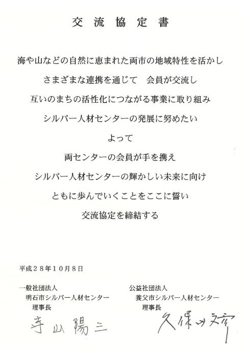 明石市シルバー人材センターと養父市シルバー人材センターは、平成28年10月8日に交流協定を締結しました。