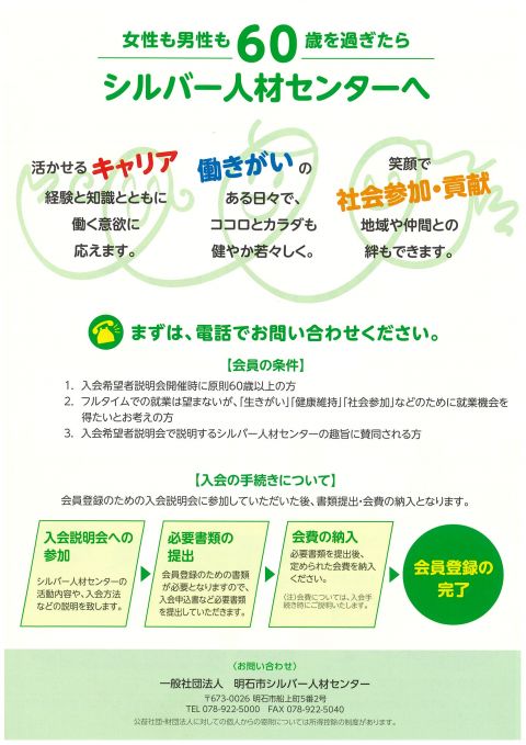 会員になるには明石市内に居住し、原則60歳以上の健康で働く意欲があり、センターの目的や趣旨に賛同していただける方ならば、どなたでも入会できます。