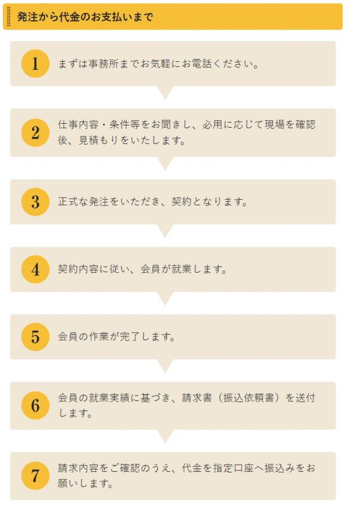 - 事業所の社員と混在して就業することや、発注者の指揮命令の下で就業する仕事は、お引き受けしていません。