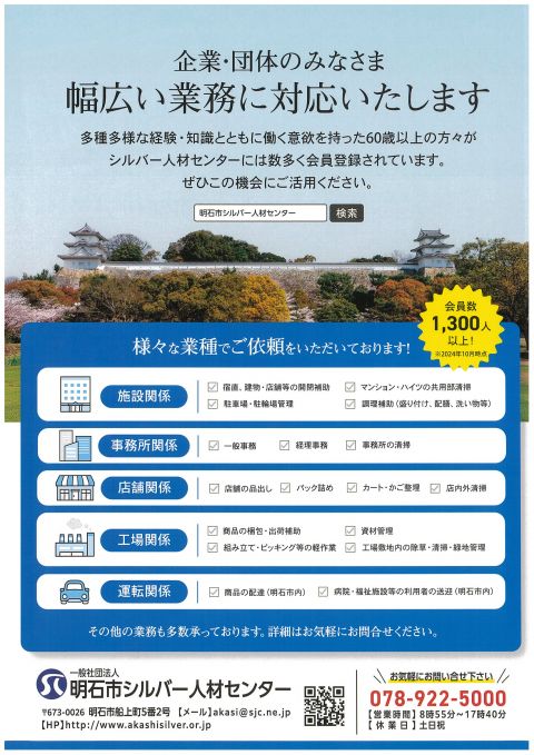 明石市シルバー人材センターには、市内在住の60歳以上で、健康で働く意欲のある方が、センターの事業趣旨に賛同し会員として登録しています。