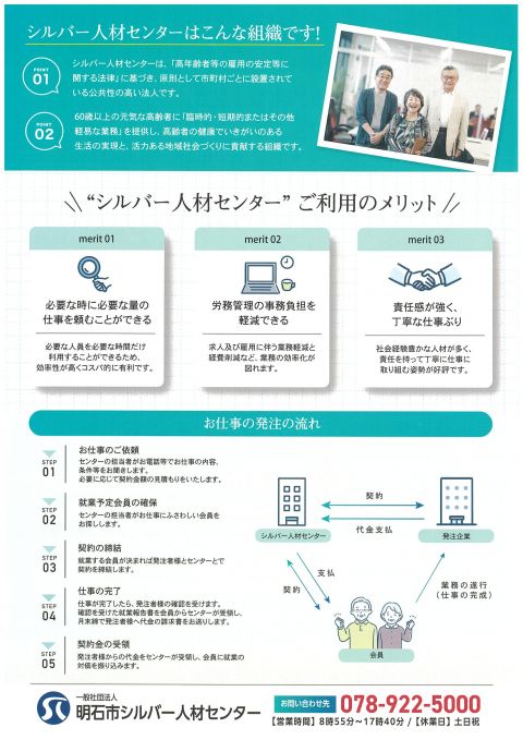 - 仕事の契約は、シルバー人材センターと発注者との間で行ない、センター・会員・発注者のいずれの間にも雇用関係はありません。