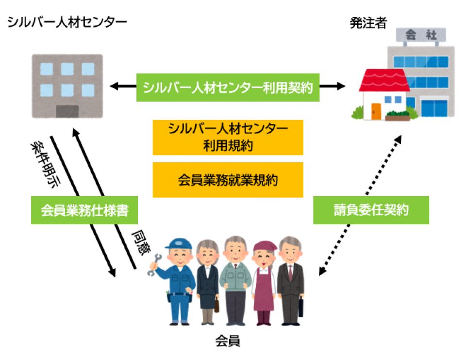 これまでの契約方法では、シルバー人材センターは、発注者から仕事の依頼を受け、会員に再依頼する形を取っています。