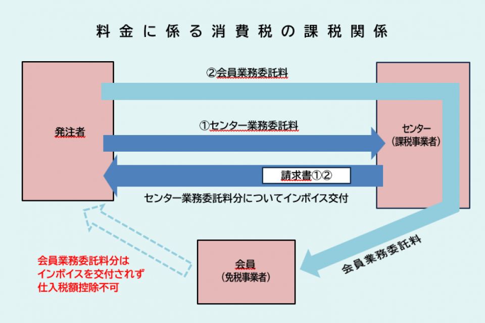 この場合、本来であれば会員が「会員業務委託料に係るインボイス」を交付する立場になりますが、 会員は基本的に年間の課税売上高が1,000万円以下の「消費税免税事業者」であるためインボイスを発行することができません。センターが発行する請求書には、次のとおり