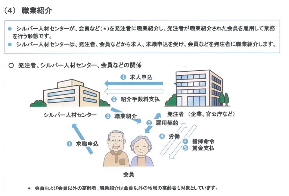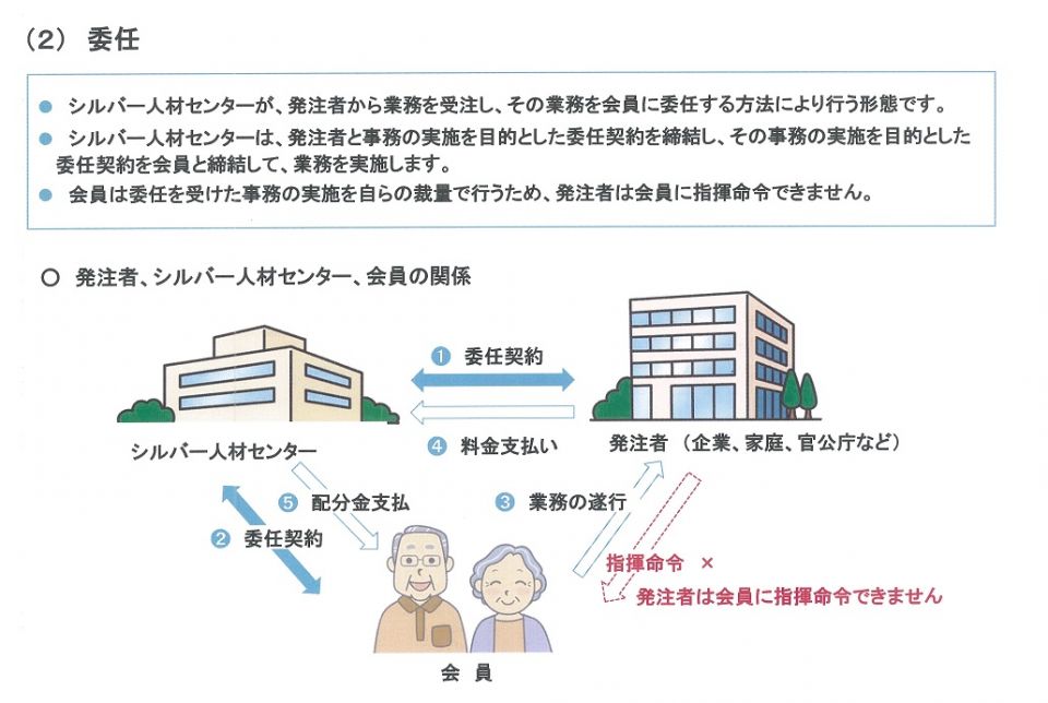 シルバー人材センターでは(1)請負、(2)委任、(3)シルバー派遣、(4)有料職業紹介といった形式による就業形態になります。