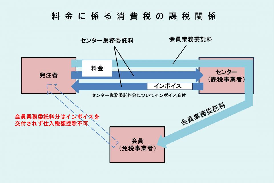 このうち、「会員業務委託料」について、新契約では、センターを経由するものの、発注者が会員に対して支払う形となります。 そのため、センターは、「センター業務委託料」の分については消費税に係る適格請求書(インボイス)を交付しますが、 「会員業務委託料」の分については交付することができません。