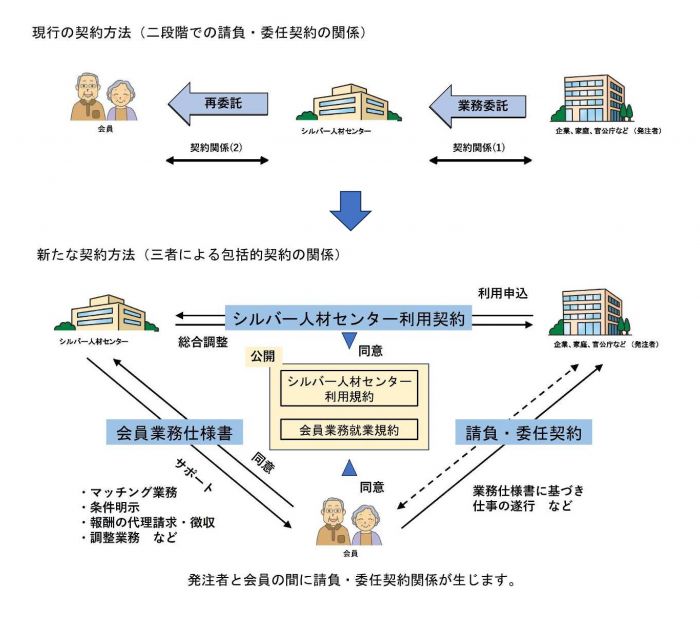 令和6年11月1日より施行された「特定受託事業者に係る取引の適正化等に関する法律」(「フリーランス法」)の趣旨に鑑み、厚生労働省から全国のシルバー人材センターに向けて「新たな契約方法(包括的契約)」へ移行するよう指針が示されたため、当センターも当該指針に基づき、契約方法を改めさせていただくこととなりました。