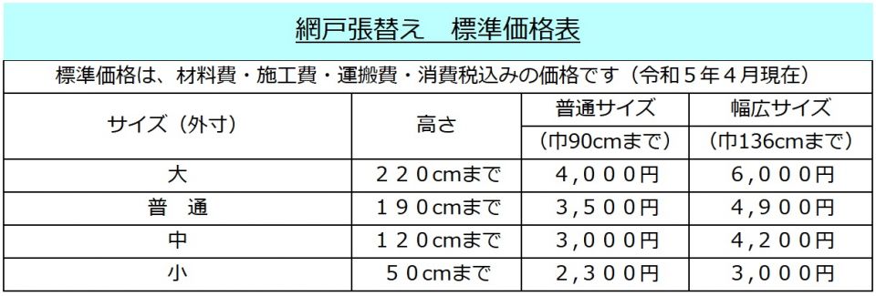 ふすまについては施工日前に見積もりに伺い、材質・絵柄等ご相談いたします。網戸・障子については施工当日に見積もりさせていただき、ご承諾のあと引き取り、施工納入になります。