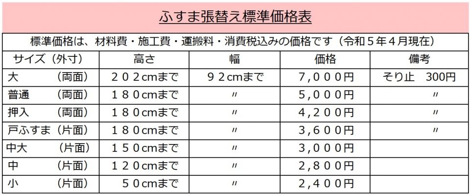 7)ビニール材、和紙材、織物材、貼り替え以外の手間や施工は、別途お見積もりいたします。