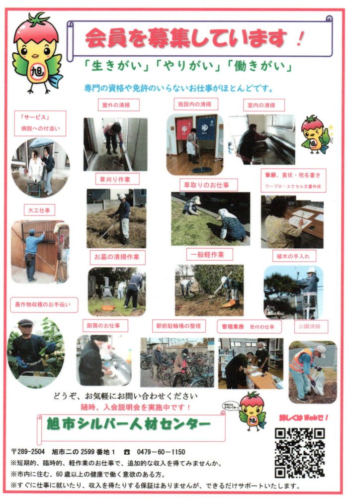 ■旭市内に居住する原則として60歳以上の健康で働く意欲があり、センターの主旨を理解し賛同される方であれば入会できます。