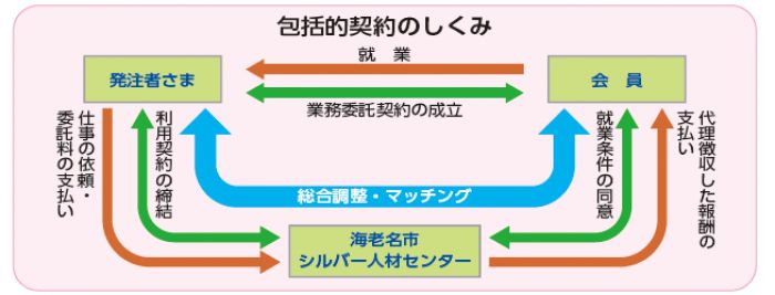 ●「特定受託事業者に係る取引の適正化等に関する法律」(いわゆる「フリーランス法」)の施行に伴い厚生労働省から示された方針に基づく契約方法(包括的契約)です。 ●この契約方法は、共通ルールである「利用規約」及び「会員業務就業規約」の定めるところにより、発注者とセンターとの間で利用契約を締結し、また、就業会員が業務仕様書へ同意することにより、発注者と就業会員との間に業務委託契約が成立することになります。 ●形式的には発注者と会員との間で契約関係が生じることになりますが、センターが発注者と会員の間に入って総合調整を行うなど手続きはこれまでと同じです。