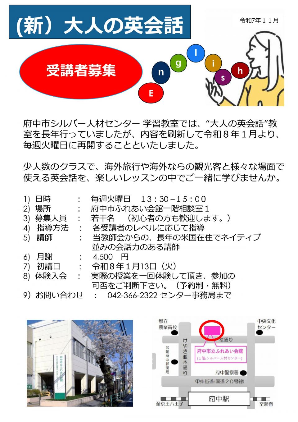 教室講師は学校の元教員や、海外勤務経験者。豊かな経験と知識を持った府中市シルバー人材センター登録会員による授業です。とても分かりやすく、楽しく、じっくりと勉強できると好評です。