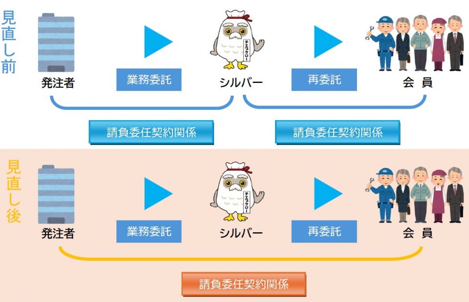 フリーランス法による保護を受け、安心・安全に就業できる環境を整備する必要があり、厚生労働省から法の趣旨に沿いシルバー人材センターの契約方法をお客様と会員との直接契約に見直すよう方針が示されました。