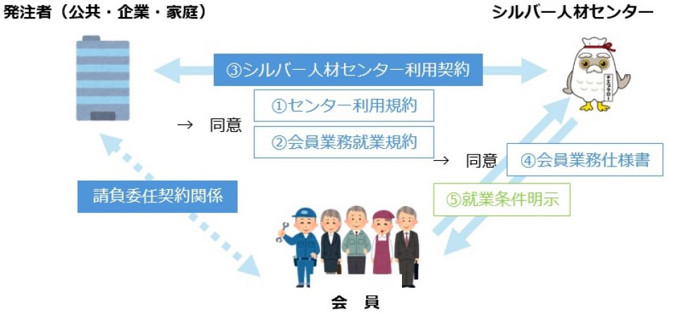 これまでの契約方法では、シルバー人材センターは、お客様から仕事の依頼を受け、契約を行い会員へ仕事の再依頼をする形をとっていました。