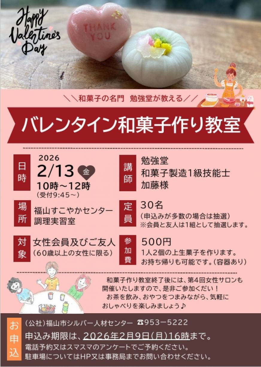 ほっこりひとこま ほっこりひとこま 2026年2月9日 みなさん、こんにちは♪ 昨日は今年一番の寒気に見舞われ、雪が降りましたね。 私の周辺では積もらなかったのですが、積もった所もあるようで・・・ 職員のけめてぃが、かわいい雪だるまを作ってくれました❤️ 蠟梅の髪飾りも、とても良い雰囲気ですね(^^♪ みなさんの中でも、雪だるまを作られた方がいらっしゃいましたら、教えてくださいね✨ (Nico) 2026年1月22日(木) 和菓子の名門・勉強堂様による「バレンタイン和菓子作り教室」を開催します。 当日は、ハート型1つ・丸型1つの上生菓子(計2つ)を作ります(*^_^*) バレンタイン前日にぴったりの、かわいらしい和菓子作りをお楽しみください。 また、和菓子作りのあとは女性サロンも開催するため、今回は女性限定の特別企画となっています✨ お友だちとの参加も大歓迎!ぜひお誘いあわせのうえ、お申し込みください❤️ 日時:2月13日(金)10:00~12:00 申込締切:2月9日(月) (NICO) 2026年1月16日(金) ふれあい同好会に所属の会員さんが、今年の干支である「馬」のぬいぐるみを作ってくださいました✨ 毛糸で丁寧に編まれた作品はとても細かく、見れば見るほど感心してしまう出来栄えです。まさに職人技ですね!! お馬さんは、事務所に入ってすぐの就業報告書の隣に飾っています♪ 事務所にお立ち寄りの際は、ぜひご覧になってみてください❤️ (Nico)