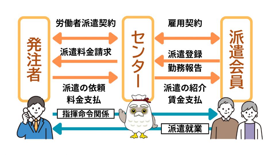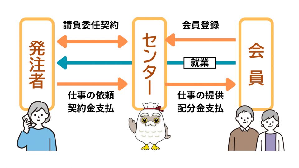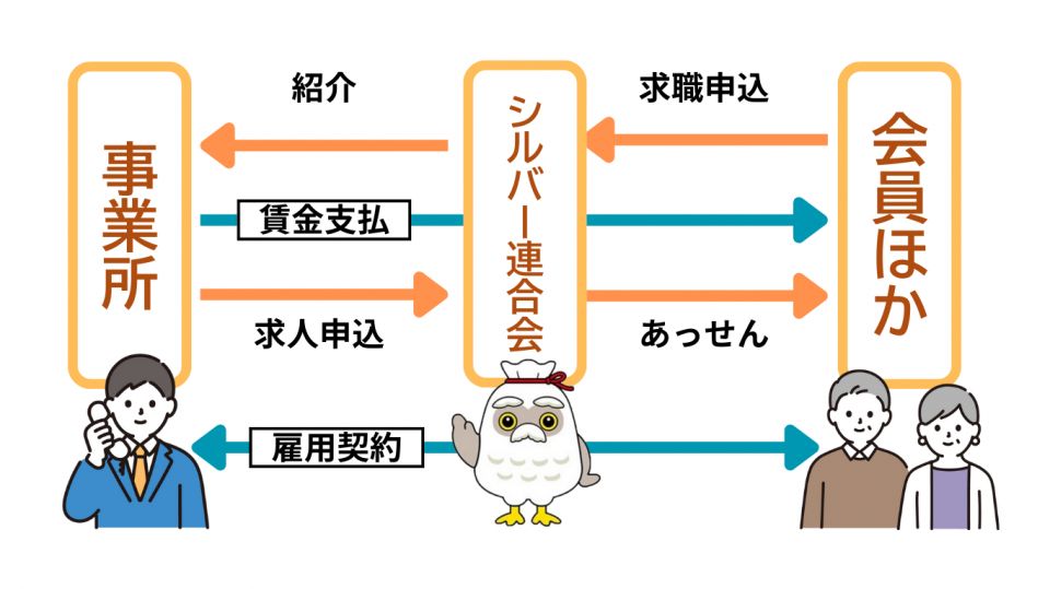 シルバー人材センターの仕組み シルバー人材センターの仕組み シルバー人材センターは、企業・家庭・公共団体などから、請負・委任、派遣などの形態で業務を受注し、臨時的かつ短期的または軽易な就業を希望する会員に提供します。 受託事業 (請負・委任) シルバー派遣事業 有料職業紹介事業