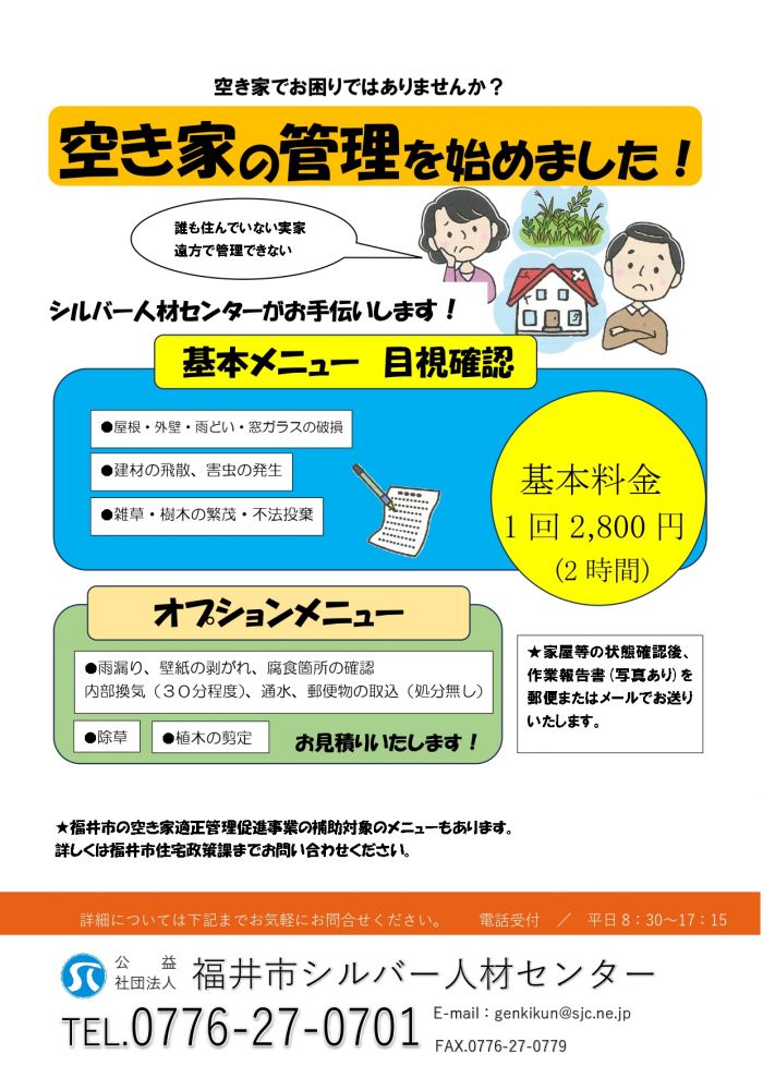空き家でお困りではありませんか?福井市シルバー人材センターではこの度、令和7年10月9日に福井市と「空き家等の適正な管理の促進に関する協定書」を締結する運びとなりました。福井市内にある空き家管理につきまして、シルバー人材センターがお手伝いさせていただきます!お気軽にお問い合わせください。