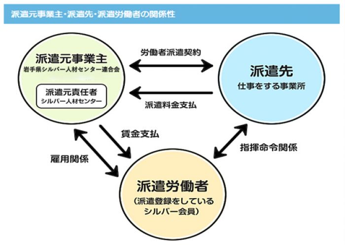 - シルバー派遣事業では、シルバー会員が派遣労働者とし、公益社団法人 岩手県シルバー人材センター連合会と雇用関係を結び、「臨時的かつ短期的または軽易な業務」の範囲内で、派遣先である会社などの指揮命令を受けて働いていただきます。(注1)