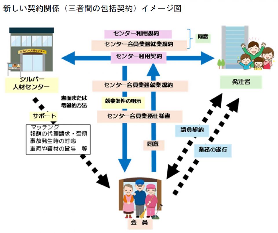シルバー人材センターの会員(以下「会員」)もフリーランス法の適用を受けます。そのため、フリーランス法による保護を受け、安心・安全に就業できる環境を整備する必要があり、厚生労働省から法の趣旨に沿いシルバー人材センターの契約方法を発注者と会員との直接契約に見直すよう方針が示されました。