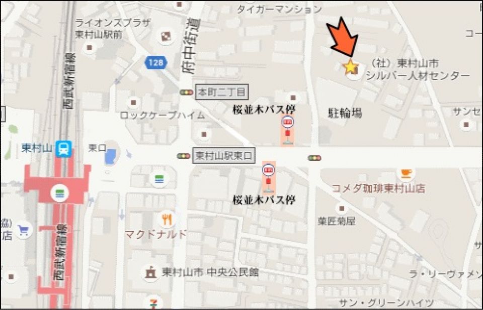 西武新宿線東村山駅東口を出てまっすぐ⇒府中街道を横切り次の信号を左折50m⇒右側駐輪場奥。駅より徒歩5分。