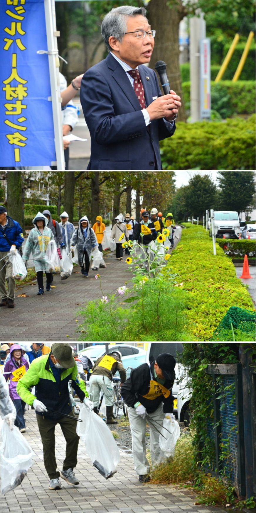 10月16日(木)、天王森公園に集合し、市民の皆さまへの感謝の気持ちを込めて、市内の主要道路でごみ拾いを行いました。
