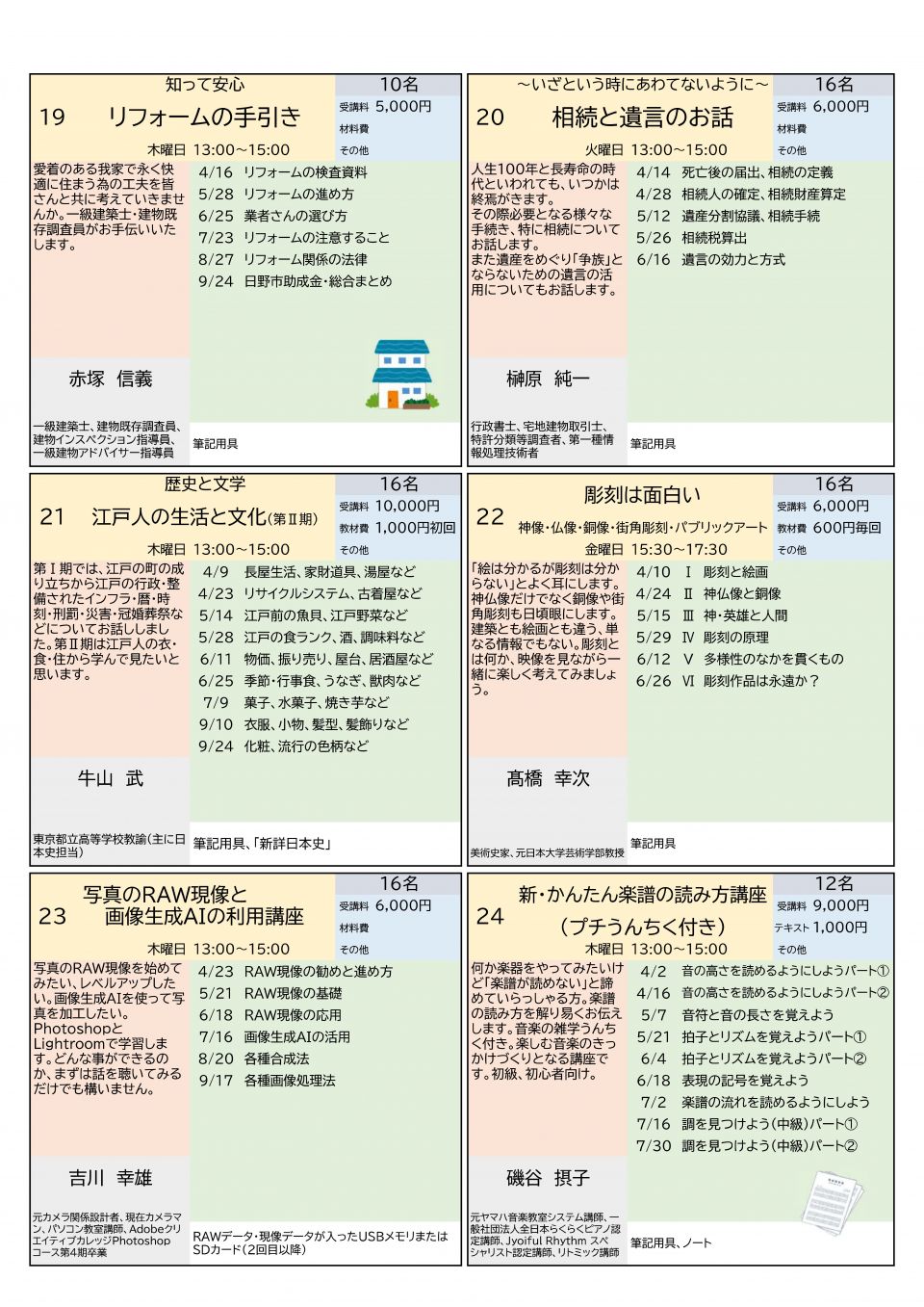 - 受講料等のお支払いは、各講座の初日に全額現金で納入ください。