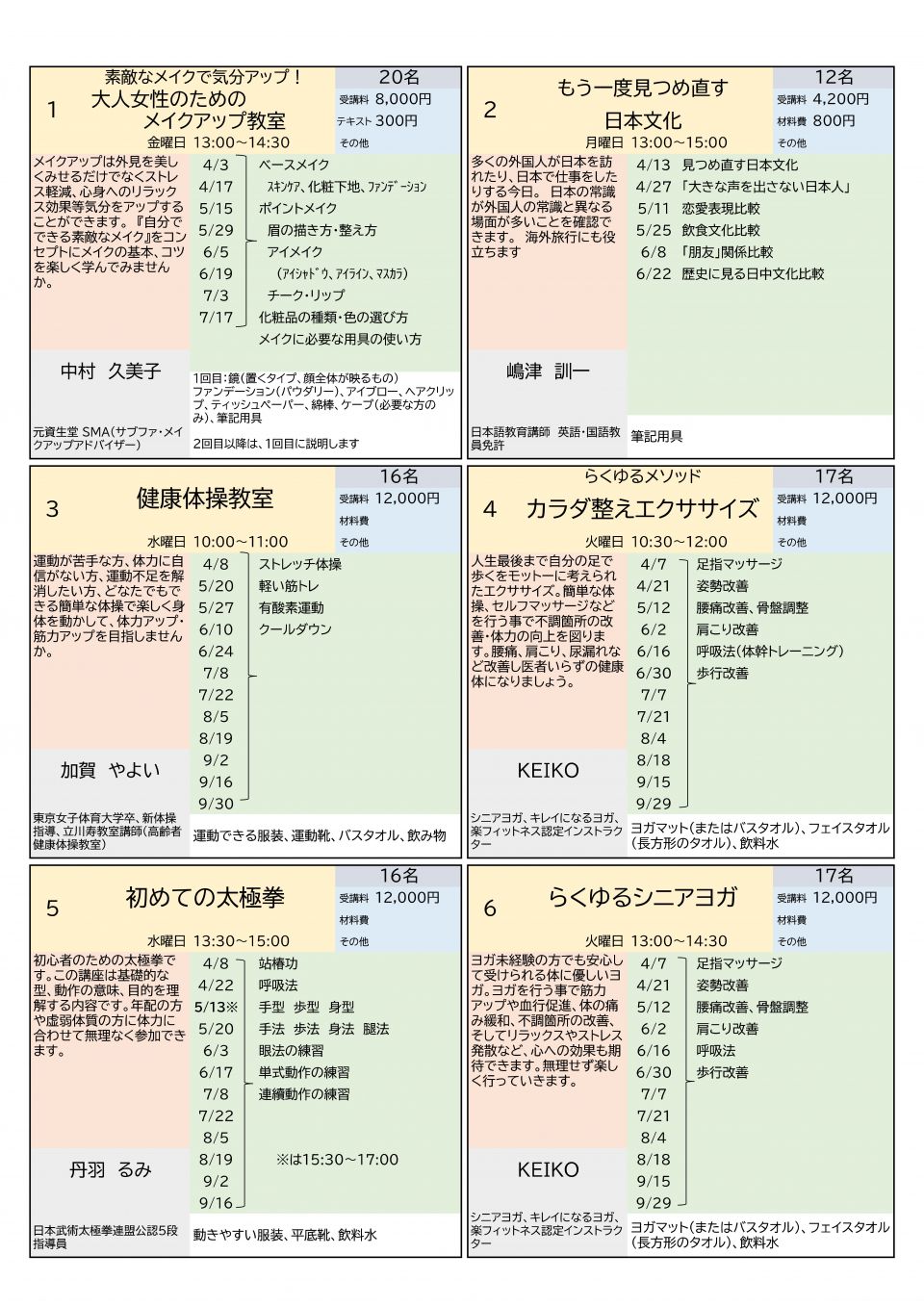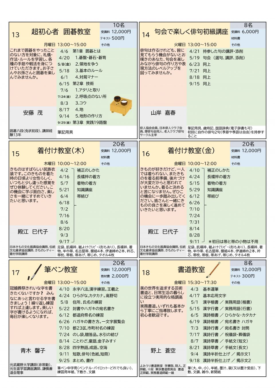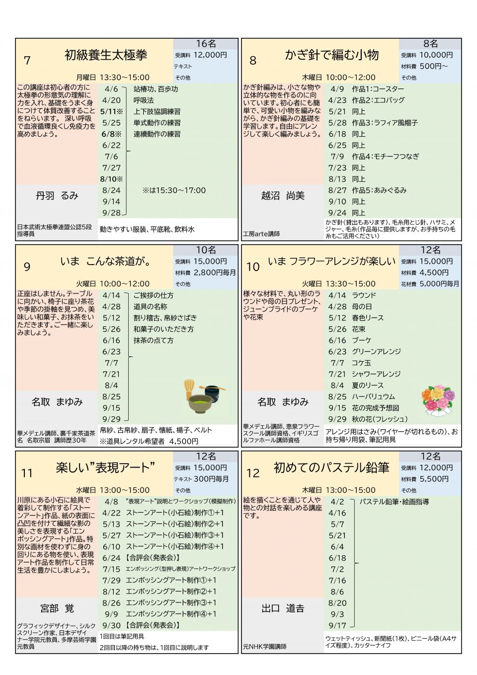 - 申込みが少数の教室は開講を取りやめることがあります。
