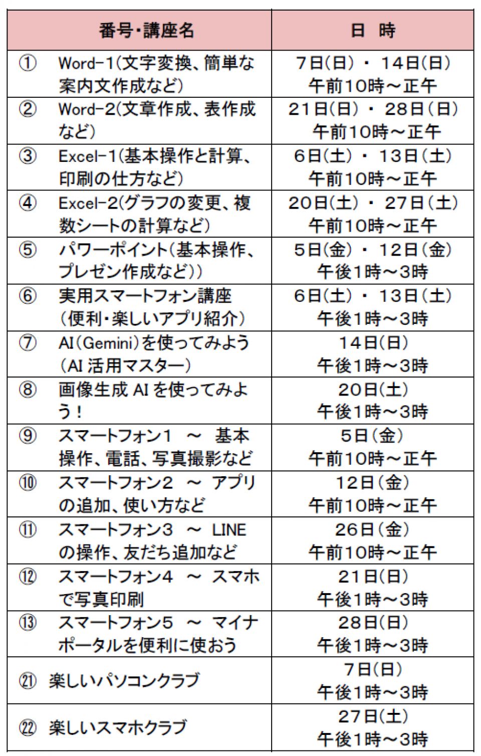 「パソコン・スマホ講座スケジュール」をご参照ください。