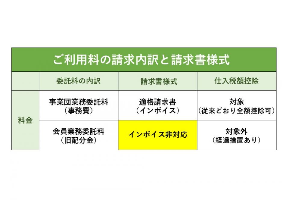 この方針を踏まえ、当事業団におきましても令和7年4月からこの新契約へ移行します。免税事業者である会員との業務委託契約の成立により、御利用料金に含まれる会員報酬部分(旧、配分金)に係る適格請求書(インボイス)の発行ができなくなります。あらかじめご了承ください。