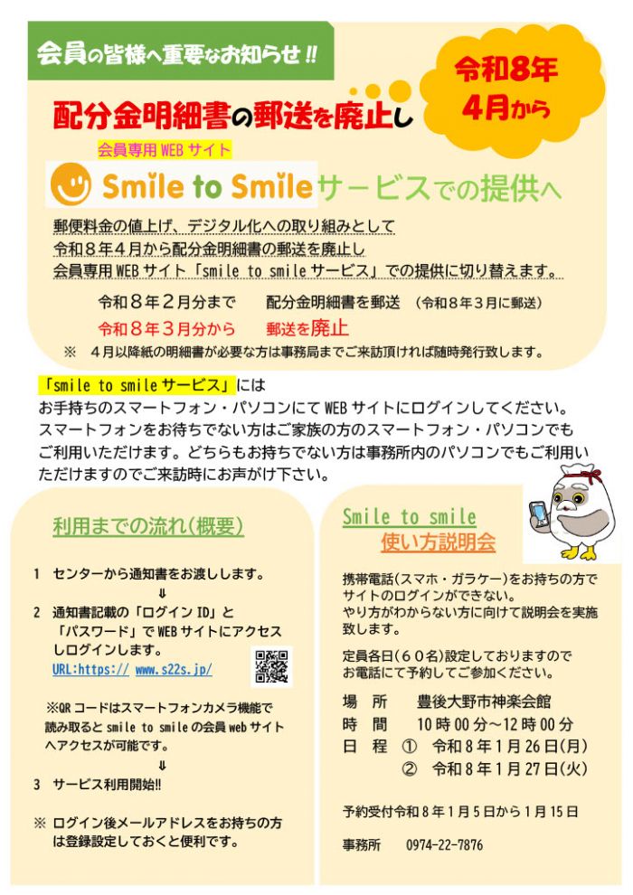 会員向けお知らせ情報 【安全就業だより】 安全就業だより R6.9月号 安全就業だより R7.2月号 安全就業だより R7.5月号 安全就業だより R7.7月号 安全就業だより R7.10月号 【お知らせ】 会員の皆さまへ フリーランス法の施行に伴い契約方法が変更になります。 形式的な契約関係は変わりますが、会員の皆さんにとって実務的には現行と変わりありませんので引き続き安心して就業していただきますようお願いいたします。 令和6年度豊後大野支所会員ボランティア作業ご案内 配分金明細書の郵送廃止のお知らせ PDFファイルをご覧になるには、Adobe Reader(アドビリーダー) が必要です。 アドビシステムズ社のサイトから最新版(無償)をダウンロードしてご利用ください。