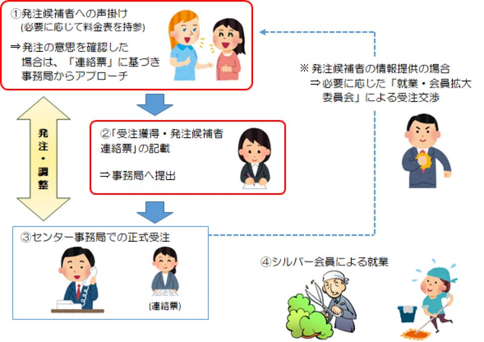 会員一人ひとりが身近な情報や視点から、センターに適した仕事を見つけ出し、仕事の獲得に結び付け、また、発注候補者に関する情報を「受注獲得・発注候補者連絡票」によりセンター事務局に提供し、就業・会員拡大委員会が仲介するなど、会員の就業機会の拡大を図る。