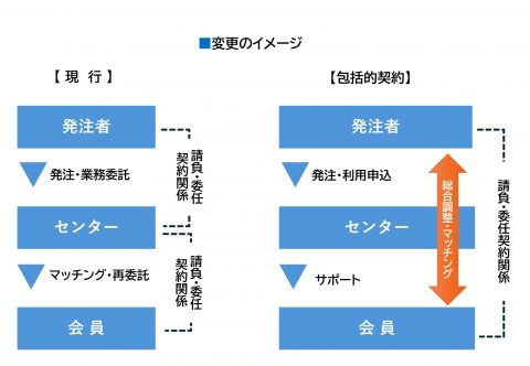 新しい新契約方法では、発注者と会員が業務委託契約関係(これまでと同様に指揮命令を伴う就業ではありません。)となるように、センターを含めた三者間の契約「包括的契約」となる仕組みです。