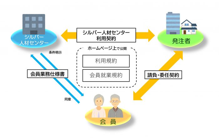 発注者は、「シルバー人材センター利用規約」と「会員業務就業規約」に同意の上、センターと「シルバー人材センター利用契約」を結びます。