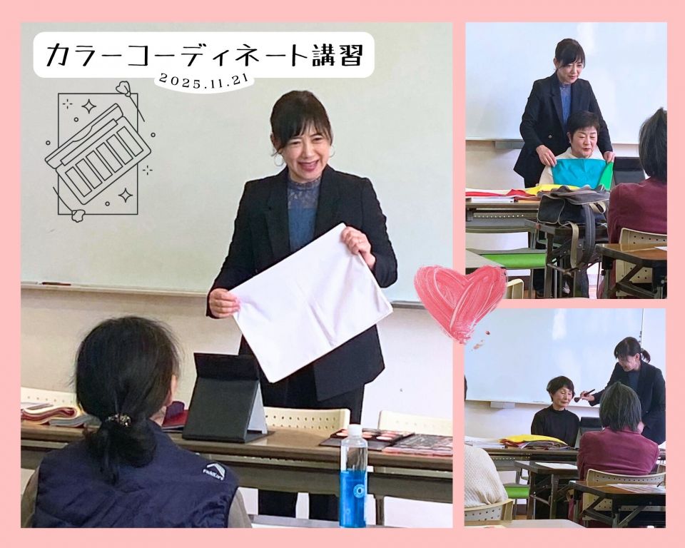 似合う色と似合わない色。選び方によって若見えしたり老けて見えたり、健康的にみえたりします。色によって人から受ける印象の違いがあることを知り、自分に合う色を見つける講習会です。先生のお話を聞き、参加してくださったみなさんはとても楽しんでくださいました。