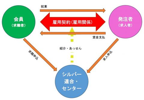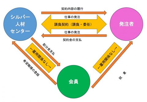 官公庁や民間企業及び一般家庭等から、高年齢者に適した仕事を、請負または委任により有償で引き受け、会員がその仕事に就業するもので、発注者との雇用関係は生じません。