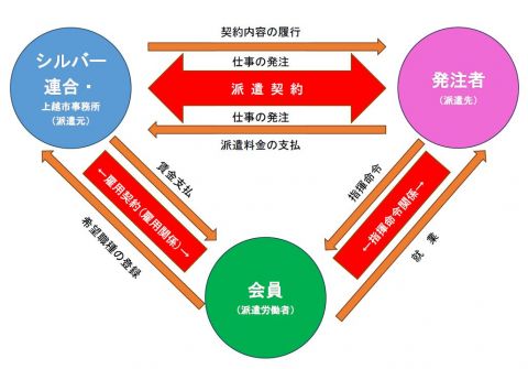 - 派遣労働会員は、派遣元事業主(新潟県シルバー人材センター連合会)と雇用関係を結び各自事業に派遣され事業所の指揮・命令を受けて仕事に従事します。