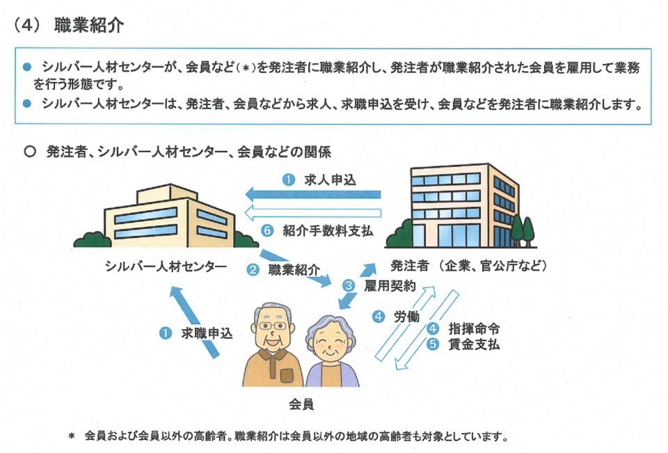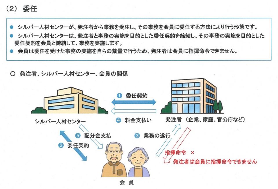シルバー人材センターでは(1)請負、(2)委任、(3)シルバー派遣、(4)有料職業紹介といった形式による就業形態になります。