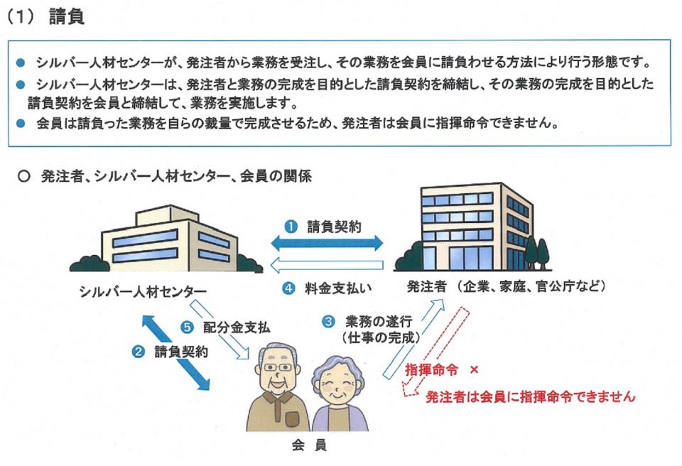 センターは、家庭、企業、公共団体(発注者)からの「臨時的・短期的又はその他の軽易な仕事」を基本的に請負又は委任の形式(派遣、有料職業紹介もあります。)により行います。