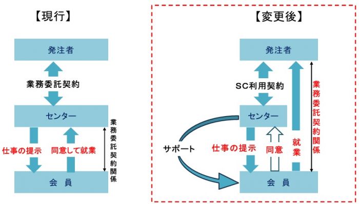 その上でセンターは、業務に係る就業条件を会員に明示し、その内容に会員が同意した場合、発注者・会員・センターの三者による包括的な契約関係が成立したことになります。