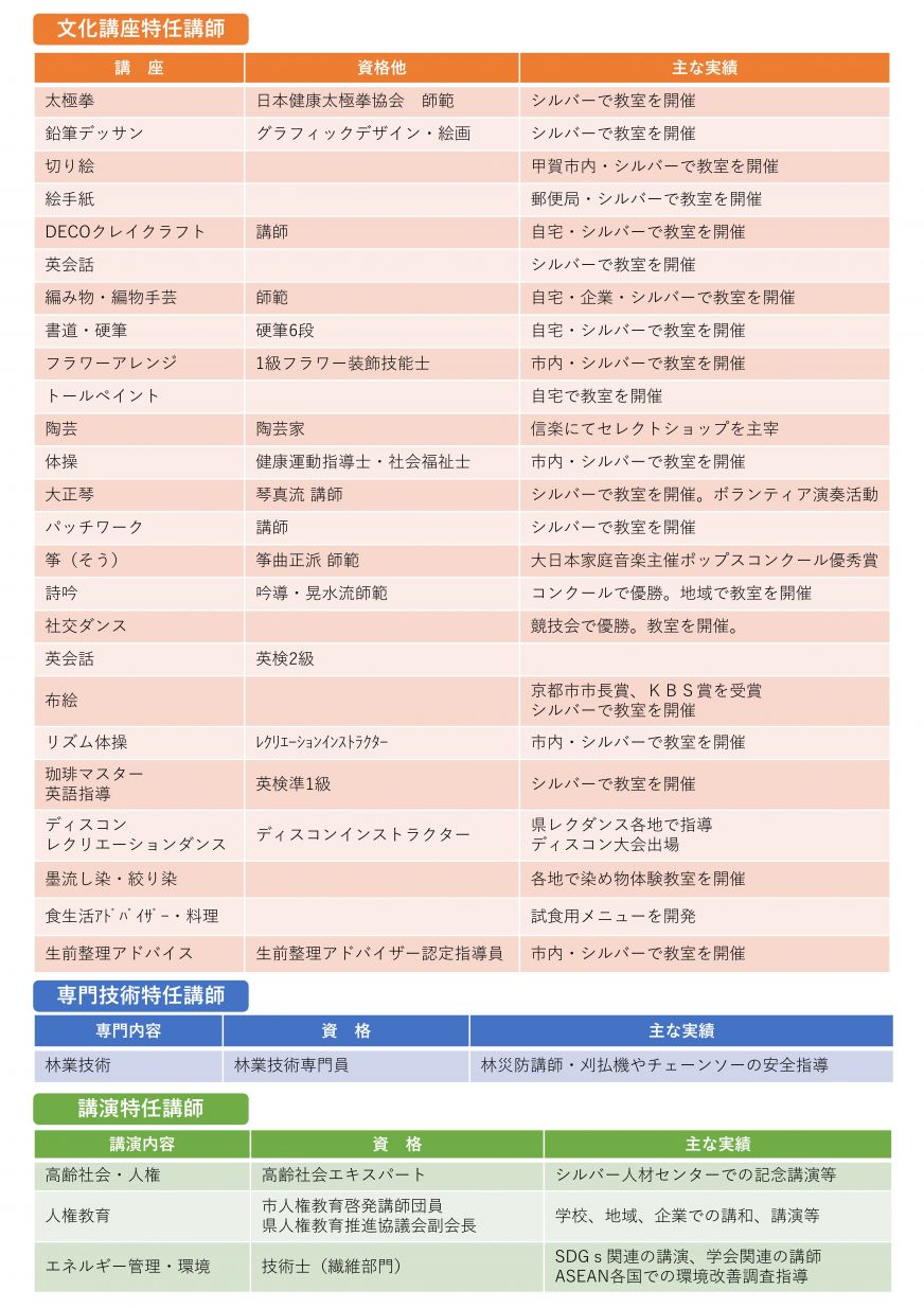 優れた技能、知能、経験等を有する認定を受けたシルバー会員を、市民等の学習活動等における講座、講演、催し物などの講師や指導者として派遣致します。