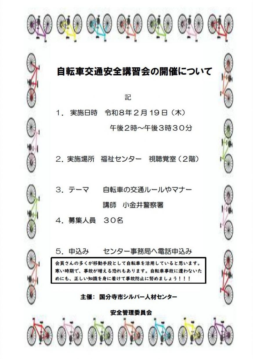 会員さんの多くが移動手段として自転車を活用していると思います。寒い時期で、事故が増える恐れもあります。自転車事故にあわないためにも、正しい知識を身につけて事故防止に努めましょう。