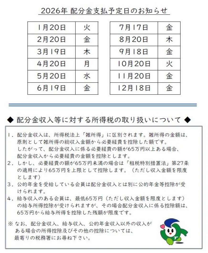 2026.1.26: 「2026年配分金支払い予定日」および「配分金収入等に対する所得税の取り扱いについて」