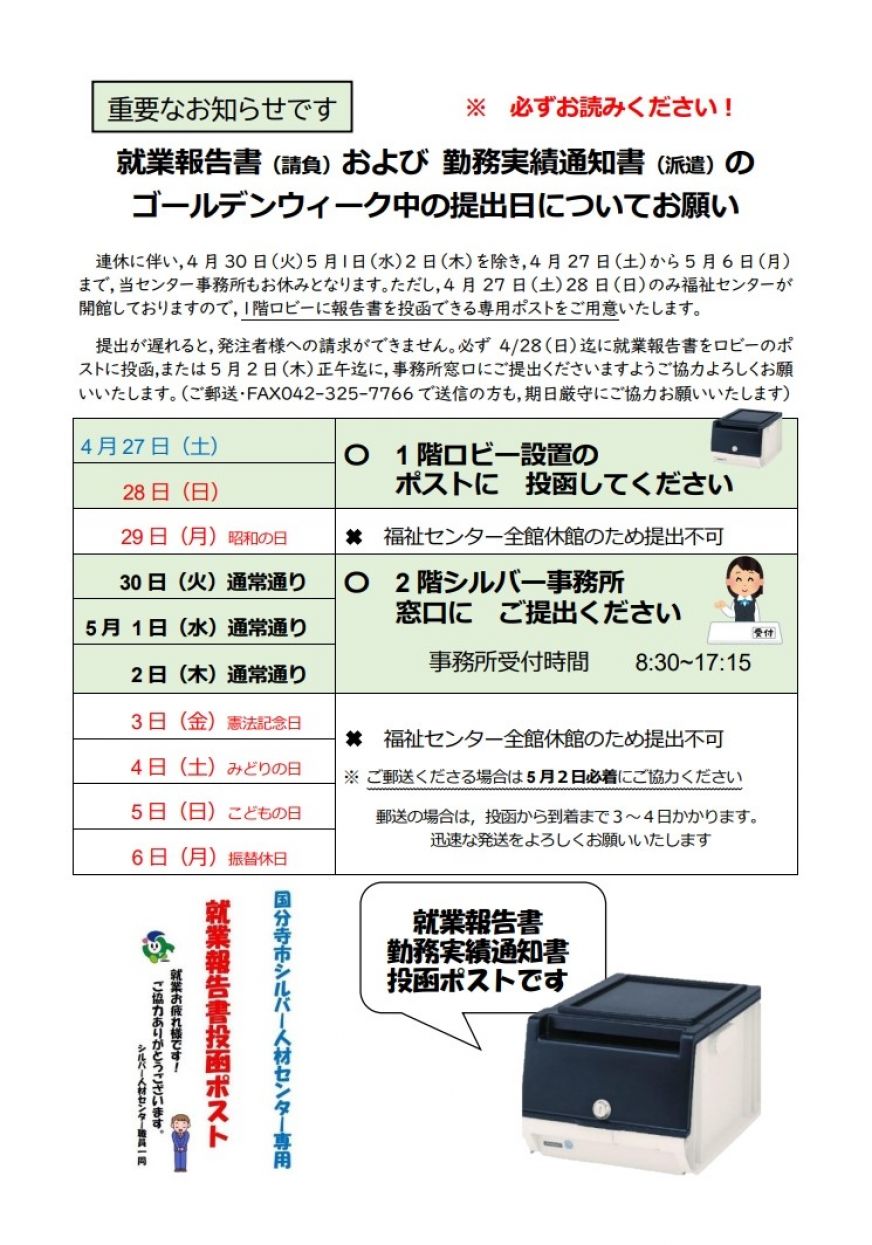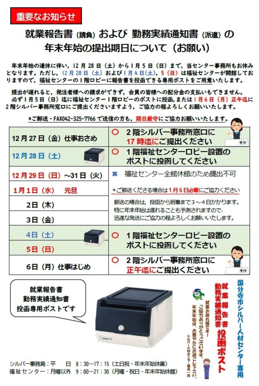 ただし、12月27日(土)28日(日)および1月4日(日)は福祉センターが開館しておりますので、福祉センターの1Fロビーに就業報告書を投函できるポストをご用意いたします。
