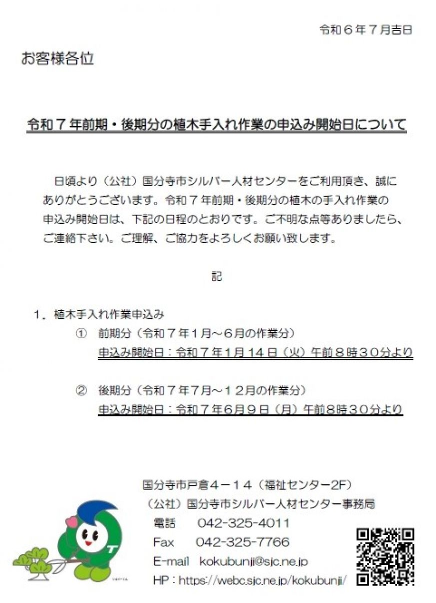 2025.12.26 : 令和8年前期(1月~6月)分の植木手入れ作業の申込み開始日について