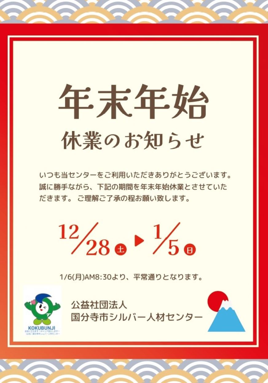 年末年始の連休に伴い、12月27日(土)から1月4日(日)まで当センター事務所もお休みとなります。