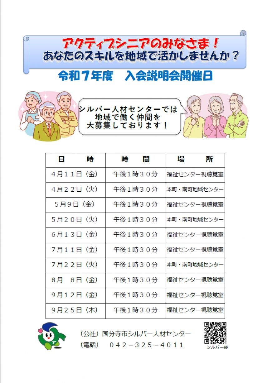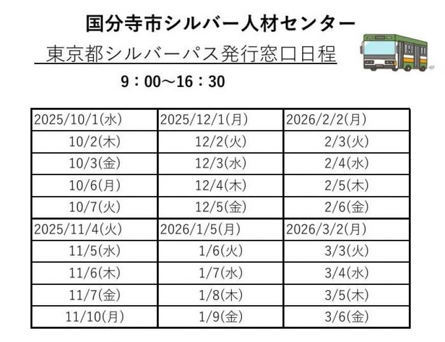 ≫≫≫国分寺市シルバー人材センター発行窓口日程表はこちらをクリック