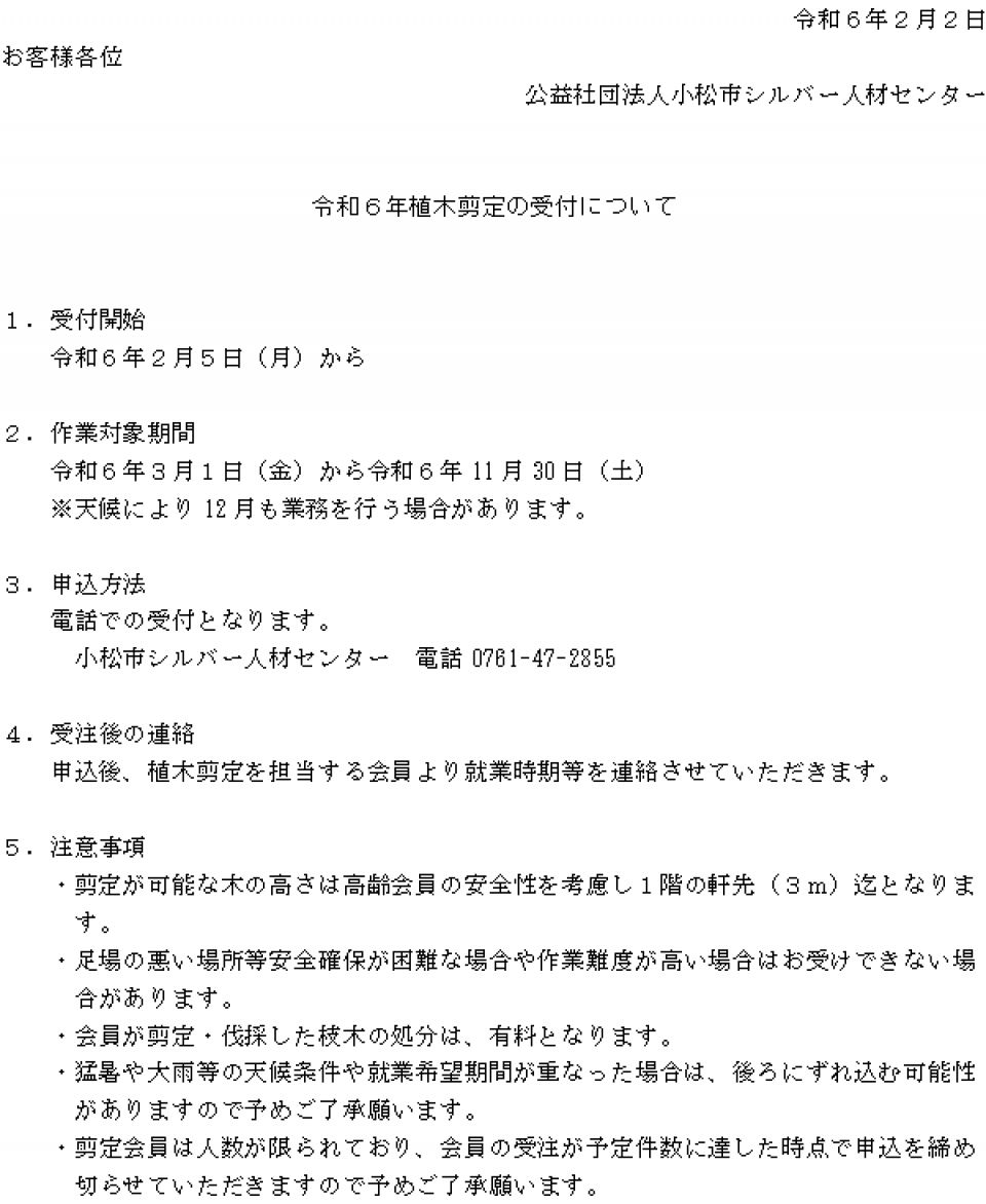 なお、私共小松市シルバー人材センターといたしましても、今後ともお客様の立場に立ったサービスの提供などに努め、より一層努力して参る所存でありますので今後とも引き続きご愛顧賜りますようお願い申し上げます。
